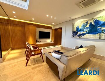 Apartamento duplex de alto padrão configurado com 03 suítes, sendo uma master Sr. e Sa. e Closets Sr. e Sa., facilmente revertida para as 04 suítes, como na planta original. Escritório em uma das suítes. A sacada é gourmet com churrasqueira a gás. Cozinha aberta tipo americana, com mesa balcão em marcenaria em madeira Carvalho e laca gofratto. Lavanderia equipada com máquina de lavar e máquina de secar roupas, separadas, e equipada com armários. Sala de estar com TV, sofá em couro da Natuzzi e painel em pedra Travertino Romano e madeira Carvalho. Sala de jantar com mesa para 10 lugares e iluminação sobre a mesa com design exclusivo. Ar condicionado em todos os ambientes. A academia é excelente, SPA , playground, quadra de squash e quadra poliesportiva, salões gourmet e com churrasqueira, brinquedoteca, entre outras facilidades como supermercado, padarias, farmácias e bons restaurantes muito perto, just walk a 5 minutes.